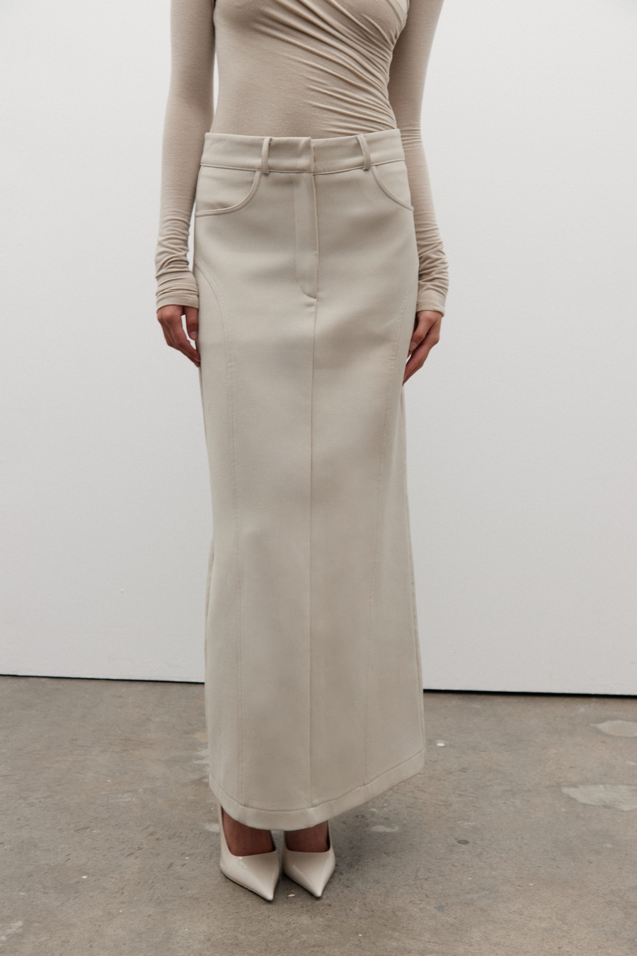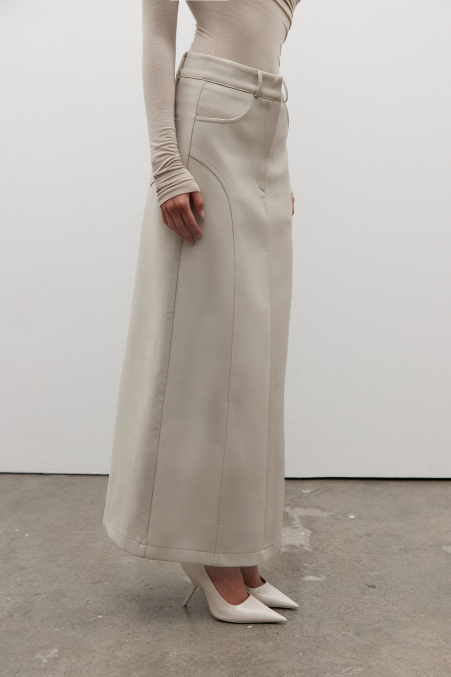 Introducing the Beckett Skirt in Bone. Featuring a maxi-length silhouette and designed in a a neutral light tone. Crafted from a quality, soft-suiting fabrication, the Beckett Skirt is the perfect addition to your workday-to-weekend wardrobe. Style with our Amrita Bodysuit in Almond to complete the look.